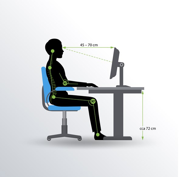 Věnujte pozornost také tomu, zda správně sedíte. Nesprávné sezení totiž vede k obtížím jako je bolest páteře, bolest hlavy, nebo porucha prokrvení končetin. Ergonomická a dle vaší výšky nastavená kancelářská židle je rovněž alfou a omegou dobře uspořádaného pracovního místa. Pro pohodlné sezení by mělo zadní opěradlo židle dosahovat až k ramenům. Správné zakřivení páteře pak podpoří regulovatelná výška bederní opěrky. Pokud není k dispozici, zkuste si pod bedra podložit polštářek.