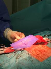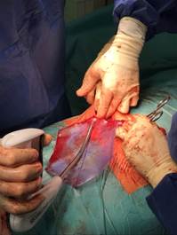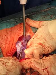 Samotný výkon probíhal v několika fázích. Preparace struktur, zhodnocení a změření defektu, výběr vhodné velikosti síťky, její umístění a fixace a uzávěr rány. Celá situace byla komplikovaná tím, že se v blízkosti defektu nacházely důležité tepny a žíly. Po důsledné preparaci, očištění a změření defektu se hlavní chirurg rozhodl pro použití síťky o velikosti 15x20 cm. Ani samotné umístění síťky nebylo jednoduché a to právě kvůli blízkosti životně důležitých cév a také přítomnosti již integrované síťky po předchozí operaci. Navzdory všem těmto nepříznivým okolnostem se lékaři podařilo novou síťku PHYSIOMESH OPEN dobře a jednoduše umístit a to díky jejímu unikátnímu tvaru a tužší struktuře. Následoval krok správné a dostatečné fixace. K tomu bylo použito všech dvacet vstřebatelných kotviček SECURESTRAPU OPEN.
