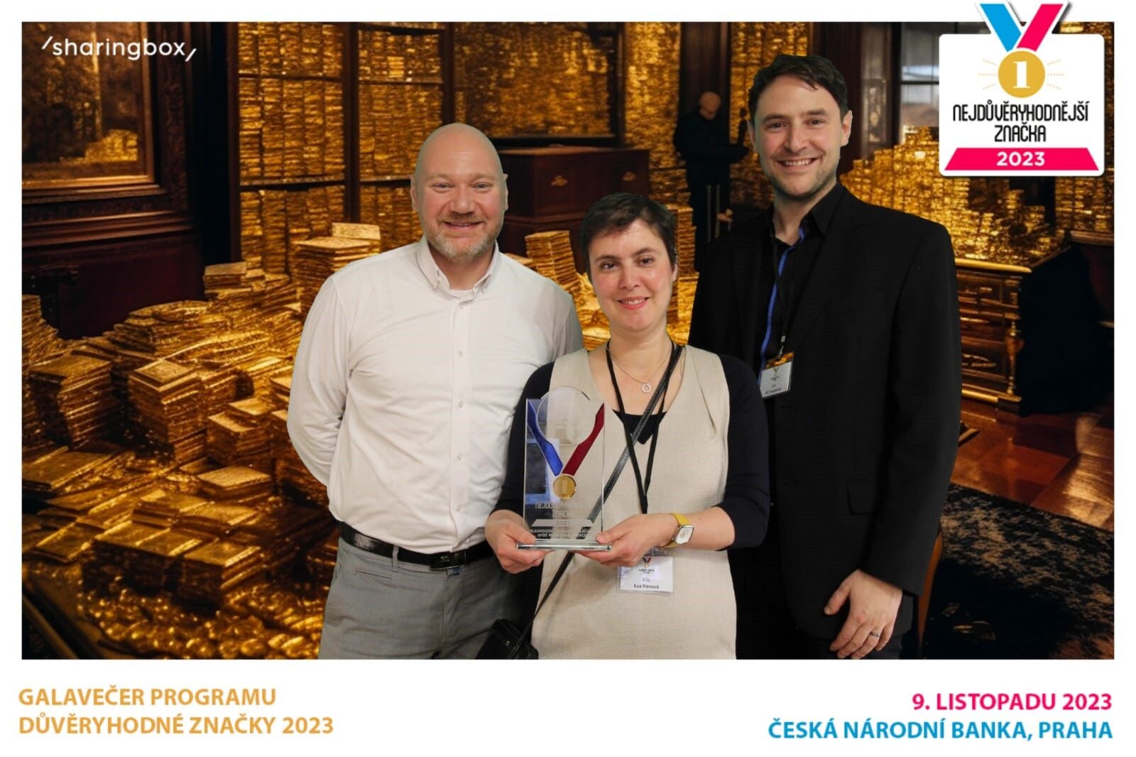 Náš marketignový tým převzal ocenění v prostorách ČNB (pozadí je fotostěna...)