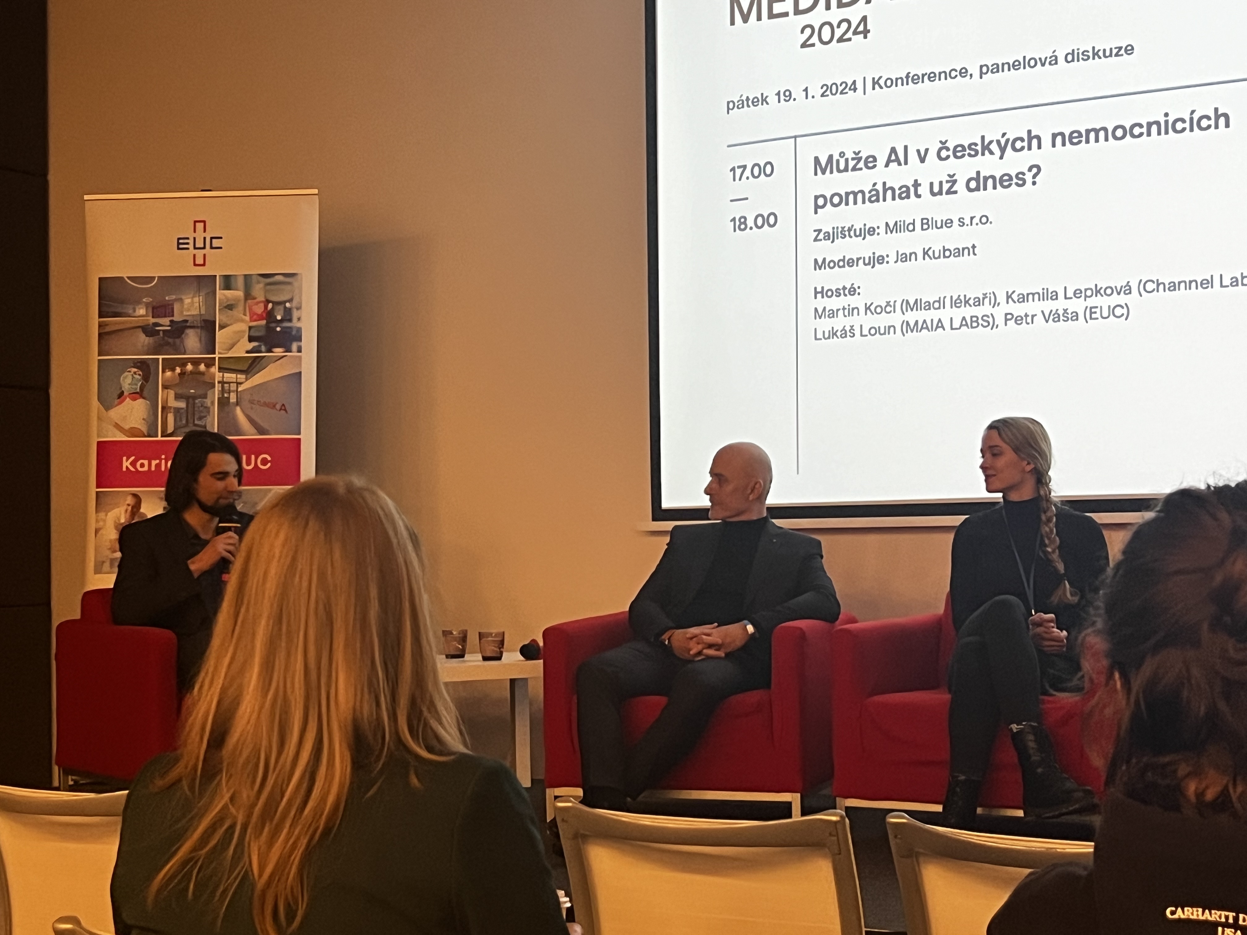 Dalšími panelisty byli MUDr. Martin Kočí, Kamila Lepková (Channel Lab), Lukáš Loun (MAIA LABS). Plný sál posluchačů hovořil za vše. Umělá inteligence se výrazně dostává do lékařské práce a EUC nezůstává pozadu. Dnes snímky EKG, magnetické rezonance analyzuje AI a je nápomocná v přesnější diagnostice.